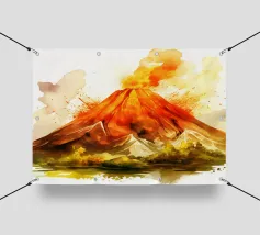 A towering volcano rises against the sky, its dark slopes streaked with old lava flows. Thick plumes of smoke curl upward from the crater, drifting into the air and painting the horizon with shades of gray. The atmosphere feels tense and alive, as if the earth itself is breathing