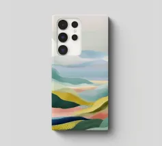 A scenic view of rolling patchwork fields rendered in bold pastels, creating a dreamlike landscape.