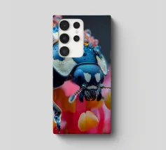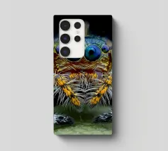 A striking close-up reveals a vibrant creature adorned with colorful patterns and intricate details. The design features a prominent eye and delicate textures