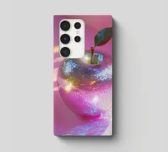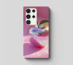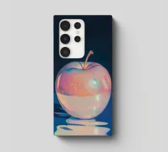 Glossy apples with a vibrant cosmic design float against a colorful background filled with sparkling lights.
