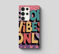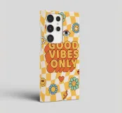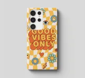 Fill your space with positivity and style with this "Good Vibes Only" digital art print. This vibrant graphic design features the uplifting message in layered orange text, set against a dynamic warped yellow and white checkered background, and surrounded by playful illustrations of smiling flowers, hearts, emojis, and other groovy symbols. It embodies a retro-inspired aesthetic designed to spread happiness and good vibes. This high-quality digital reproduction boasts a resolution of 7000x5000 pixels at 300 dpi, ensuring outstanding clarity, sharp lines, and brilliant colors. An ideal print for