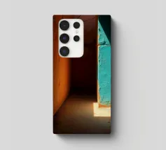 Soft sunlight filters through a turquoise window, casting shadows on orange walls. A clay pot sits on the wooden floor, enhancing the artistic ambiance of the space.