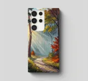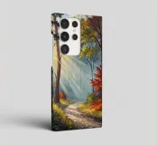 This image depicts a serene and inviting pathway winding through an autumnal forest. The scene is bathed in soft, ethereal sunlight filtering through the tall trees, creating a captivating play of light and shadow. The path, rendered with visible brushstrokes, suggests a well-trodden route, inviting the viewer to explore deeper into the woods. The foliage showcases a rich tapestry of fall colors, with vibrant reds, oranges, and yellows contrasting against the deeper greens and browns of the forest. The overall effect is one of tranquility and natural beauty, capturing the essence of a peaceful