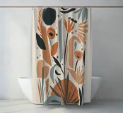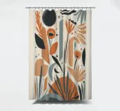 A modern abstract composition of various stylized botanical shapes and leaves in a palette of terracotta, beige, and dark blue against a light background.