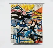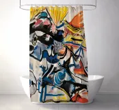 This vibrant and energetic abstract expressionist painting features a dynamic interplay of forms, colors, and textures, creating a sense of controlled chaos. Bold brushstrokes in blue, black, white, and orange dominate the canvas, with hints of yellow and green in the background. Recognizable elements, such as what appears to be a butterfly and fragmented facial features, emerge from the abstract composition, inviting multiple interpretations. This high-quality digital poster (7000x5000 pixels, 300 dpi) perfectly captures the raw emotion and spontaneous energy of abstract expressionism, making