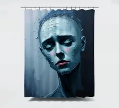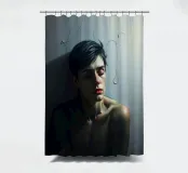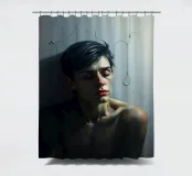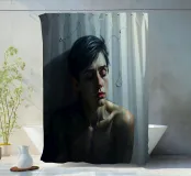 A person with short hair sits against a wall in a softly lit room, conveying deep emotion and introspection. The atmosphere feels heavy and contemplative, enhancing the mood.