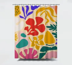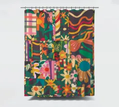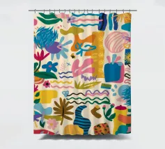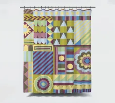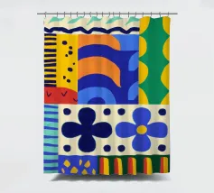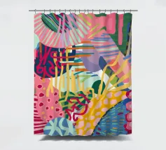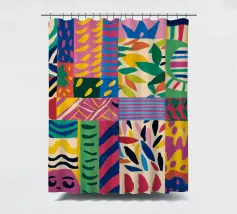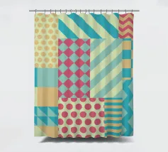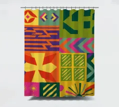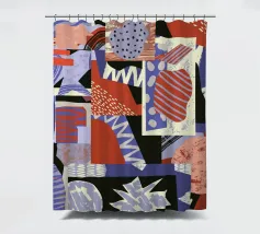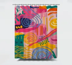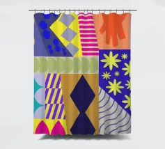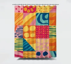 An abstract pattern combines patchwork-like color blocks with energetic scribbles and stripes, creating a dynamic, playful, and artistic design.