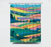 A beautiful landscape of rolling hills and fields, rendered in a colorful patchwork of greens, blues, pinks, and yellows, evoking a sense of idyllic countryside.