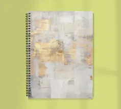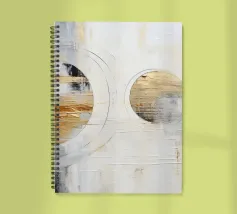 This artwork is an abstract composition in panoramic format, characterised by a dynamic mix of textures, colours and geometric shapes. Concentric golden circles create a sense of movement and depth. The texture is rich, with visible brushstrokes and layers of colour that create a special atmosphere. The interplay of green and earth tones with metallic accents gives the work a harmonious yet vibrant energy.