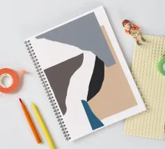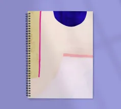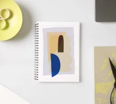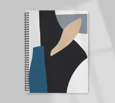 Several distinct shapes and colors dominate the composition, offering a minimalist and abstract aesthetic. A bold blue shape is juxtaposed with a tan form on the left and a white elongated form on the right.