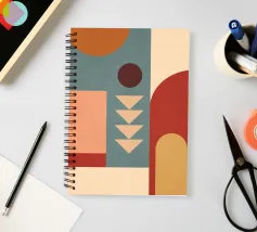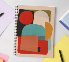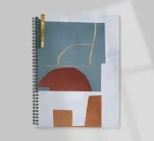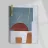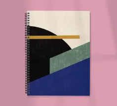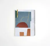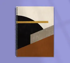 Geometric shapes and earthy tones create a modern design with abstract lines and forms. The composition includes overlapping rectangles and a semi-circle, highlighted by gold accents.