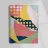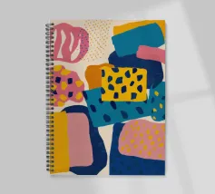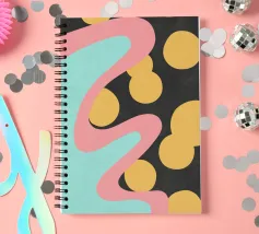 A dynamic and colorful abstract collage features overlapping shapes with various patterns, including polka dots, stripes, and solid colors, creating a joyful, energetic feel.