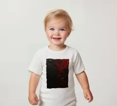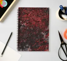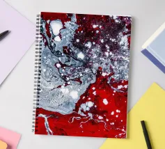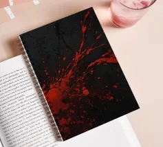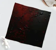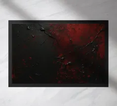 Bold black and red paint splashes cover a dark surface, creating an abstract design. The contrasting colors emphasize texture and depth, enhancing artistic expression.