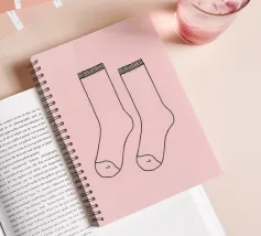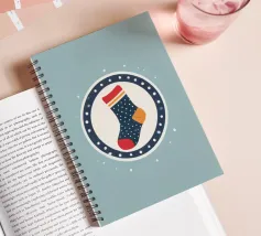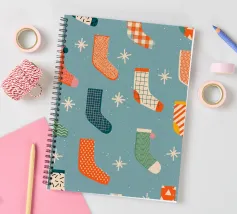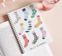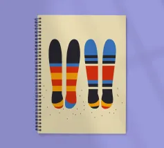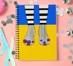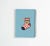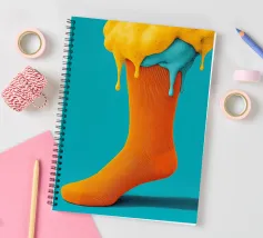 A vibrant sock illustration features bold stripes and colorful dots against a soft blue backdrop. The playful design showcases artful creativity and graphic elements, enhancing its appeal.
