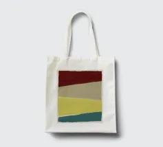 The image features bold horizontal stripes in red, beige, yellow, and teal. The arrangement of colors creates a layered effect.