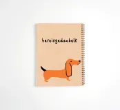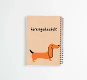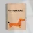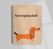 The motif shows a cute orange dachshund with the humorous text "Herein gedackelt" on a beige background. Designed in warm orange and brown tones, the image combines humour and charm in a charming way. A playful, minimalist illustration that will brighten up any entrance area with a smile.