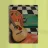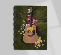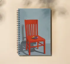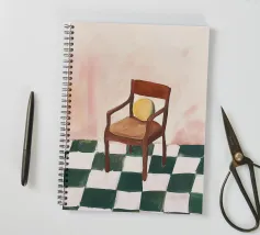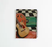 An acoustic guitar rests on a red chair beside a checkered floor, inviting stories in sound and solitude.