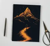 A mysterious hiker strides along a glowing path through a nocturnal mountain landscape - this artwork combines mysticism with a sense of adventure. The path, bathed in golden light, leads directly to an imposing mountain peak surrounded by stars. The scenery is both calm and meaningful and invites you to see yourself as a seeker in a world full of possibilities. The contrast between deep darkness and warm glow creates a captivating atmosphere that is particularly appealing to lovers of symbolic and inspiring motifs.