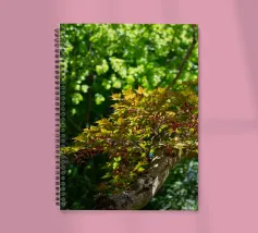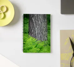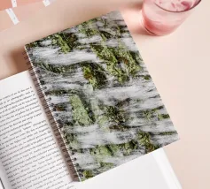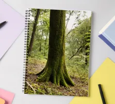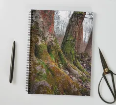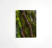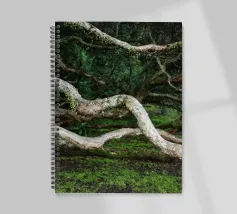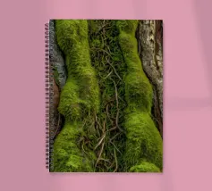 The bark of a large tree is adorned with vibrant green moss, intertwined with twisting branches, reflecting the tranquil ambiance of a forest in the early morning light.