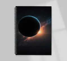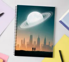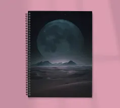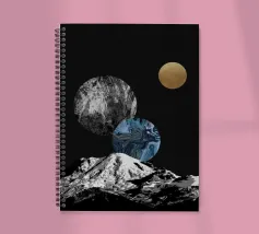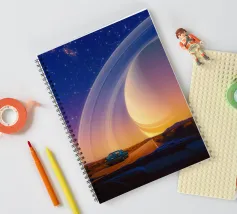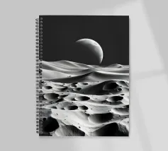 A large planet adorned with rings floats above a barren terrain, while distant celestial bodies illuminate the starry sky. Shadows of mountains add depth to the surreal setting.