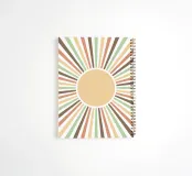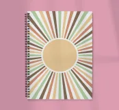 Radiating lines in earthy tones such as green, brown, and orange extend outward from a central circle, creating a sunburst effect. The design features a retro aesthetic with symmetrical patterns and a soothing color palette.