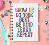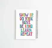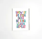 Embrace growth with this vibrant typography art print. "Show Up Do Your Best Be Kind Learn Repeat" comes alive in rainbow watercolour lettering on white. It's an engaging piece radiating positivity, perfect for offices, bedrooms or studies. A colourful reminder of self-improvement, it brightens any space and prompts positive habits. Let this print inspire consistent effort, kindness and learning in your daily life.