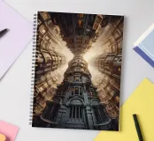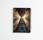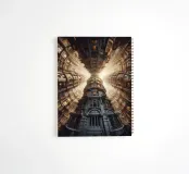 A surreal depiction of towering, symmetrical architectural structures converging toward a glowing central light. The intricate designs, warm illumination, and dramatic perspective create an awe-inspiring and otherworldly visual.