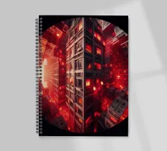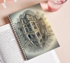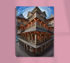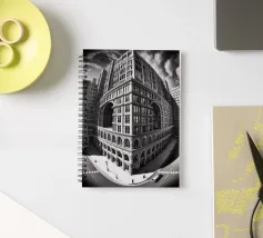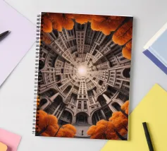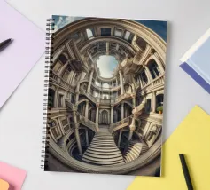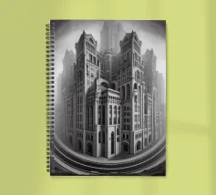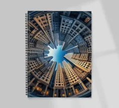This image depicts an awe-inspiring circular architectural arrangement featuring tall, modernized classical buildings converging toward the sky. A prominent statue in the center enhances the dramatic perspective under a textured cloudy blue sky.