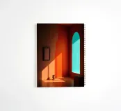 Soft sunlight filters through a turquoise window, casting shadows on orange walls. A clay pot sits on the wooden floor, enhancing the artistic ambiance of the space.
