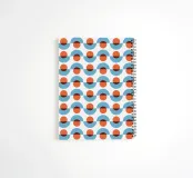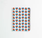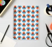 A repetitive geometric pattern features alternating rows of semicircles and circles in blue and rust colors against a light background. The design creates a sense of rhythm and movement through its symmetrical arrangement.