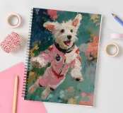 Oil painting of a white dog in a pink spacesuit flying through space. Impressionistic style with playful, romantic elements, vivid colours, pastel background and bold brushstrokes and palette-knife strokes for a dreamlike, cute scene.