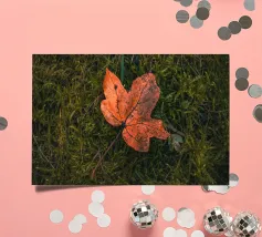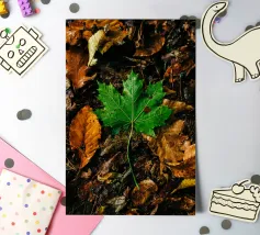 A red leaf lies on the ground, its color glowing warmly against the earth as a sign of autumn.