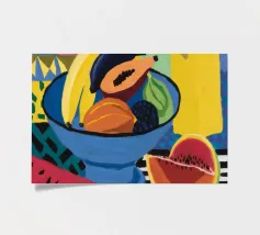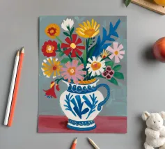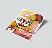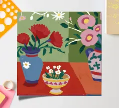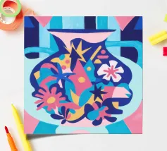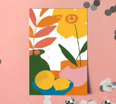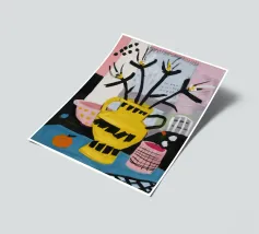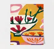 A bold and graphic abstract floral piece. Stylized flowers and leaves in a bowl are depicted with strong outlines and flat areas of color, creating a dynamic, modern, and highly decorative work of art.