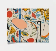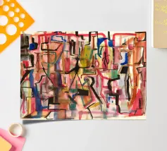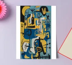 This vibrant and energetic abstract expressionist painting features a dynamic interplay of forms, colors, and textures, creating a sense of controlled chaos. Bold brushstrokes in blue, black, white, and orange dominate the canvas, with hints of yellow and green in the background. Recognizable elements, such as what appears to be a butterfly and fragmented facial features, emerge from the abstract composition, inviting multiple interpretations. This high-quality digital poster (7000x5000 pixels, 300 dpi) perfectly captures the raw emotion and spontaneous energy of abstract expressionism, making