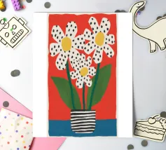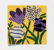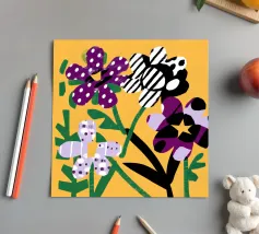 A vibrant, abstract garden scene rendered as a patchwork of dotted and patterned flowers against a dark background. The artwork is a joyful and imaginative interpretation of a blooming garden.