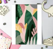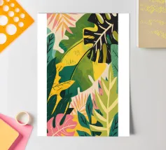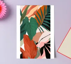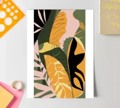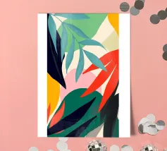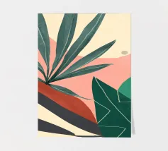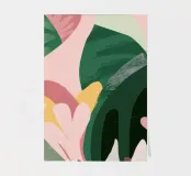 An elegant abstract artwork features overlapping leaves and organic shapes in a sophisticated palette of green, pink, and white, creating a modern and graceful botanical composition.
