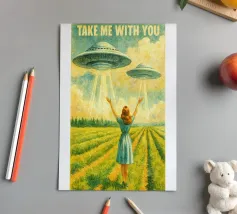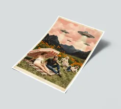 Aliens in their UFOs spaceships switching dimensions from outer space to a village amongst the mountains in Norway. Retro 50s woman watching the phenomenon, hoping to not get abducted. Surreal retrofuture sci-fi collage art by MsGonzalez.