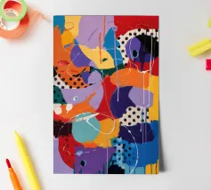 This painting is a bold and colorful abstract composition with a mix of organic and geometric shapes. The use of bright colors and dynamic forms creates a sense of movement and energy.