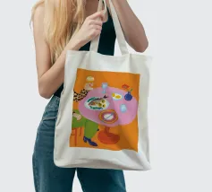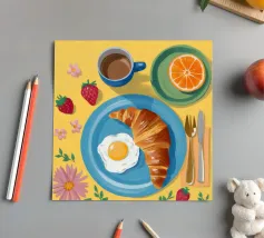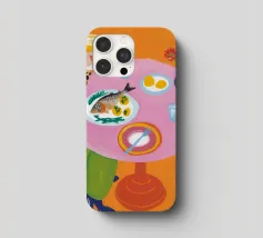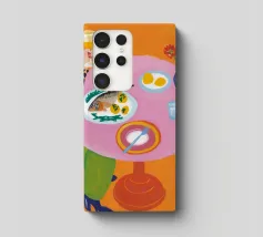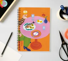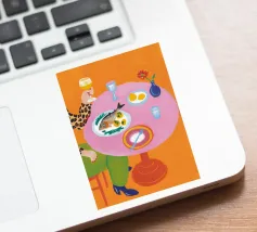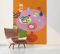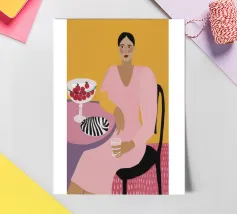 A woman dines at a pink table dressed in patterns and poise, embodying chic brunch flair.