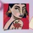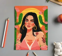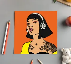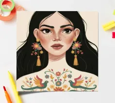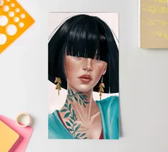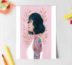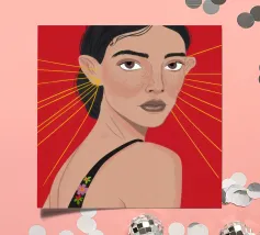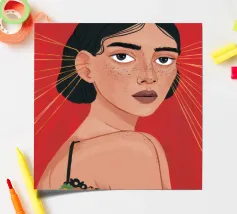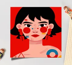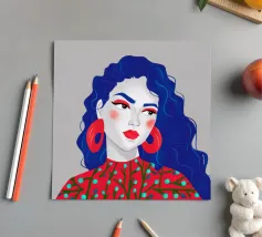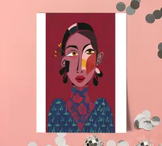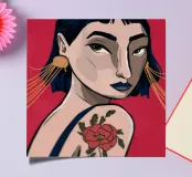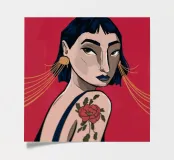 This painting depicts a person with a tattoo of a rose on their shoulder. The person is wearing large, golden earrings, and the background is a striking red, emphasizing the bold and expressive nature of the artwork.
