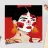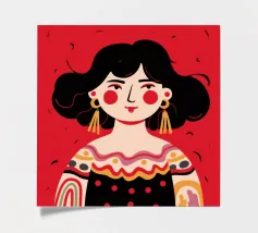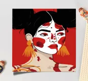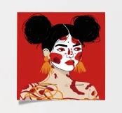 This painting depicts a person with dark hair styled in two buns, wearing large orange earrings. The person's face is painted with bold red and white patterns, and the background is a solid red color.