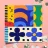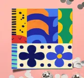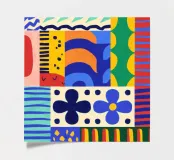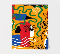 A bold and dynamic abstract composition filled with stylized flowers, geometric patterns, and organic shapes in a vibrant primary color palette. The artwork has a playful, folk art feel with a modern twist.