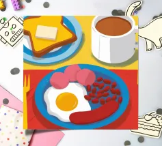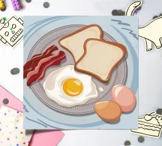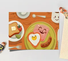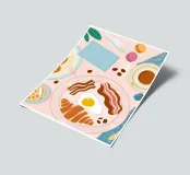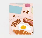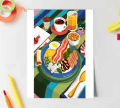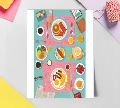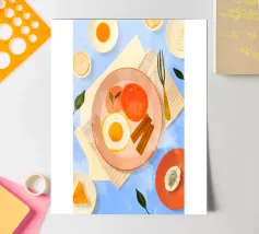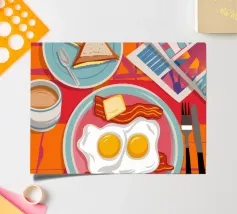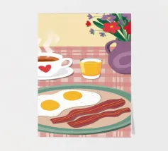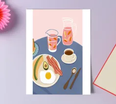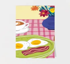 A top down view of a breakfast table with a croissant, bacon, eggs, coffee, and a letter. The style is modern, clean, and captures a perfect morning moment.