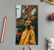 Buddy takes a good look at the soggy streets of Chicago. Beneath his yellow coat, his introspective gaze betrays a certain melancholy. Yet his heart is beating wildly at the thought of the next escapade that awaits him. Buddy, the writer dog, dreams of discovering the soul of this misty city, capturing the essence of its urban glow and writing its history in the style of the Beats.