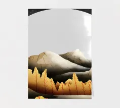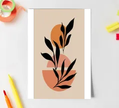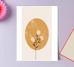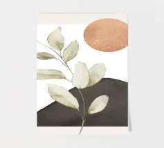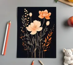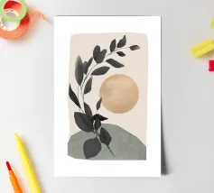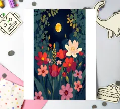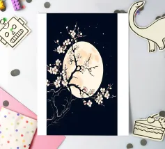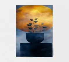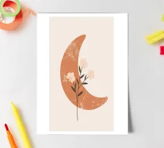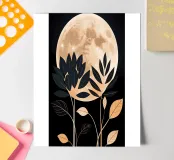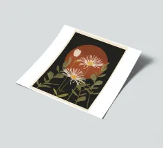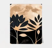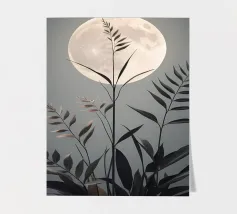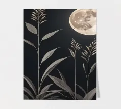 This captivating print features a full moon, bathed in a soft, golden glow, against a deep black backdrop. Two elegant, stylized flowers, one with dark, almost iridescent petals and the other with delicate, golden leaves, stand tall beneath the lunar orb. The interplay of light and dark, combined with the intricate details of the floral elements, creates a truly mesmerizing piece that will add a touch of celestial beauty to any space.
