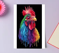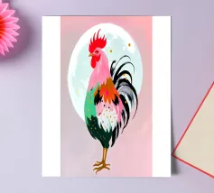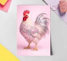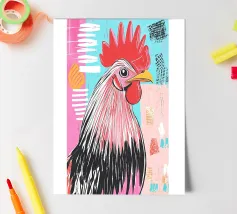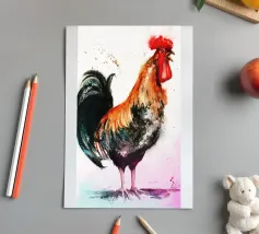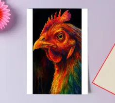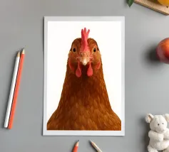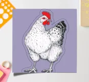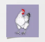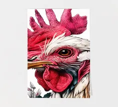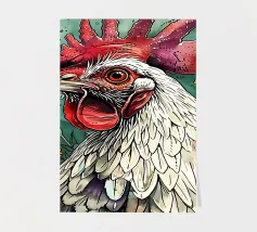 A fineliner and watercolor marker drawing of a chicken. She is white and black and red.