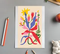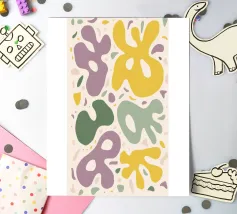 A vibrant and playful abstract pattern of interlocking, fluid shapes in a lively palette of pink, yellow, blue, and green. The composition is energetic and full of joyful, organic movement.