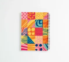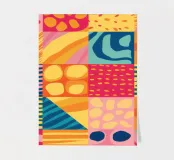 A vibrant and cheerful abstract piece resembling a patchwork quilt, with various patterns and textures in bright, sunny colors. The artwork is a joyful celebration of color and form.