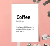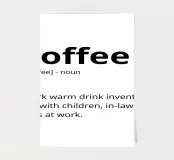 A humorous definition of coffee describes it as a necessary remedy for dealing with everyday challenges like children, in-laws, and coworkers. The text playfully mimics a dictionary entry with phonetic spelling and part of speech.