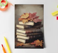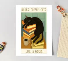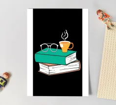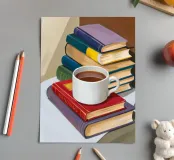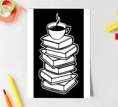A simple, cozy still life of a cup of hot coffee resting on a stack of old books. The play of light and shadow creates a warm, intellectual, and comforting atmosphere, perfect for any book lover.